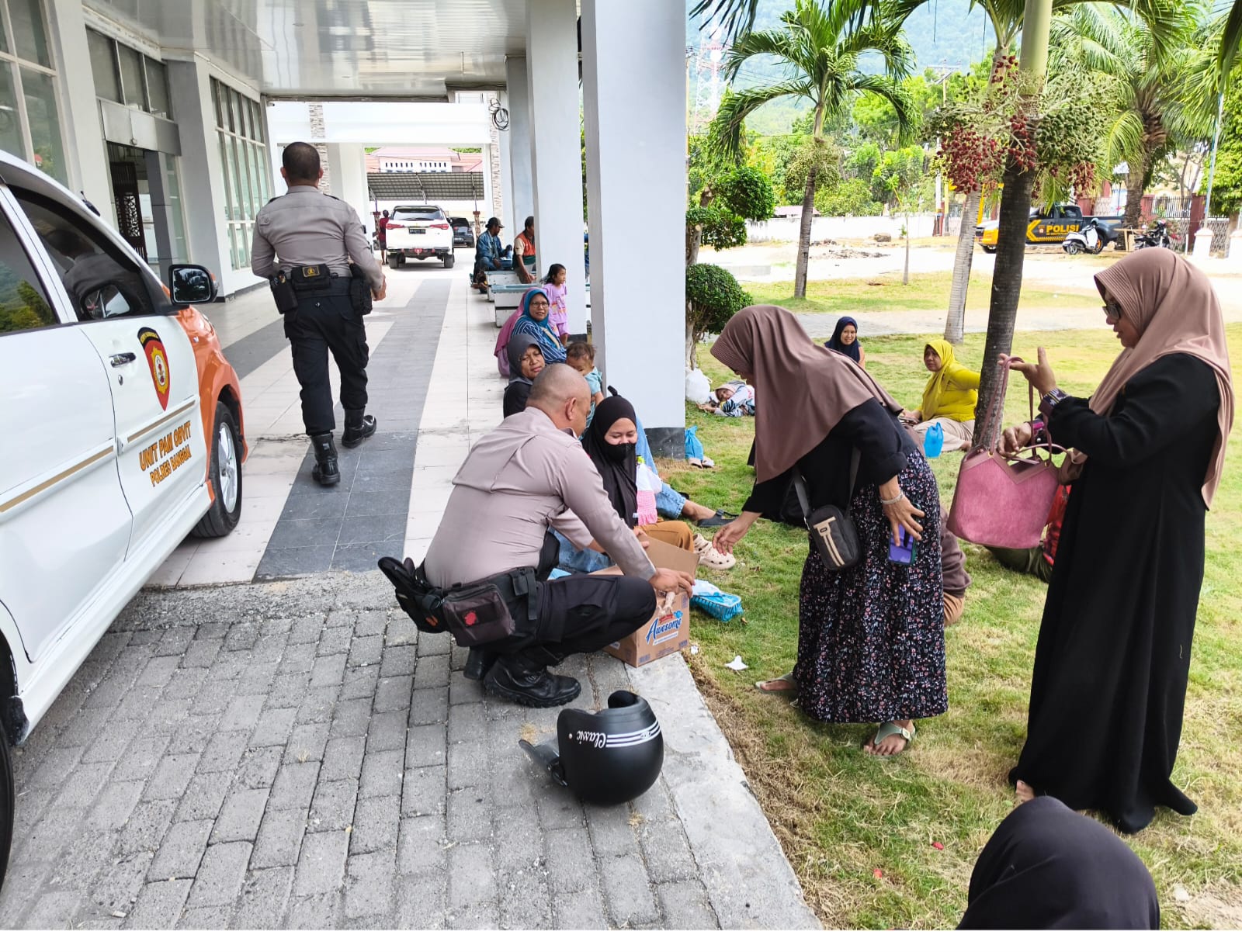 Sejumlah aparat Kepolisian dari Polres Banggai membagi-bagikan air mineral kepada sebagian warga Tanjung yang menunggu di pelataran atau halaman Kantor DPRD yang berada di Teluk Lalong tersebut.