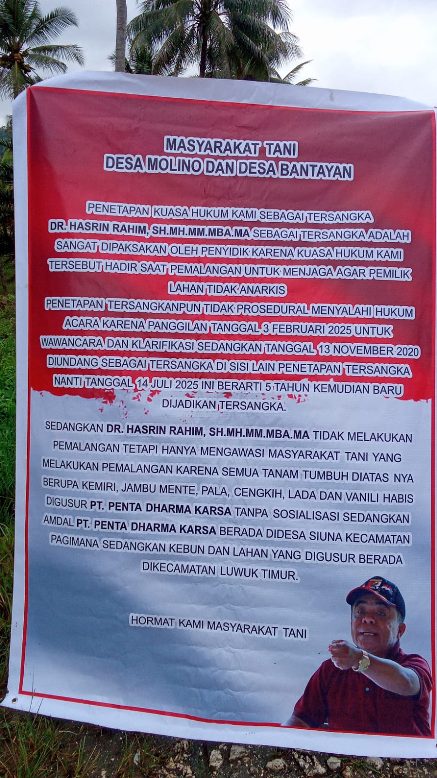 BANGGAI – Puluhan warga Desa Molino Kecamatan Luwuk Timur meminta pihak Polres Banggai agar menghentikan proses hukum kepada kuasa hukum, Hasrin Rahim, karna dinilai sebuah bentuk kriminalisasi terhadap perjuangan tanah mereka.