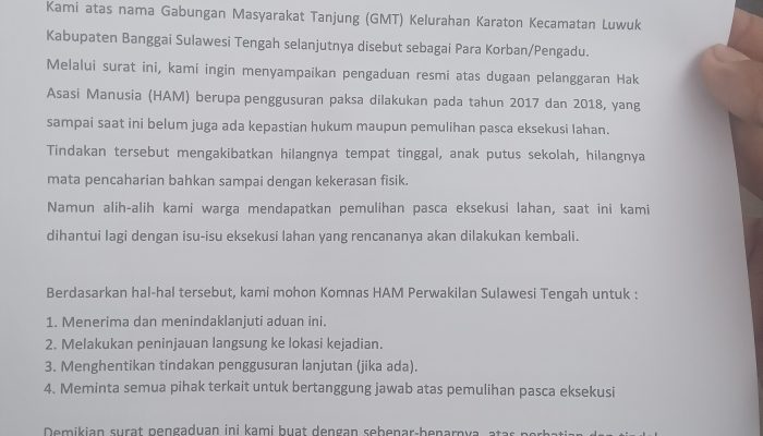 BANGGAI – Isu rencana eksekusi lahan membuat resah warga yang berada di Tanjung Sari Kelurahan Karaton Kabupaten Banggai. Atas hal itu warga kembali mengadu ke Komisi Nasional Hak Asasi Manusia (Komnas HAM) Sulawesi Tengah.