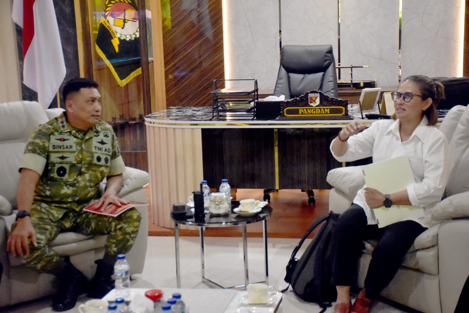 Tim Satgas PKA yang dipimpin Ketua Harian Satgas Eva Bande diterima oleh Panglima Kodam XXIII/Palaka Wira, Mayor Jenderal TNI Jonathan Binsar Parluhutan Sianipar, di ruang kerjanya, Jumat 9 Januari 2026.