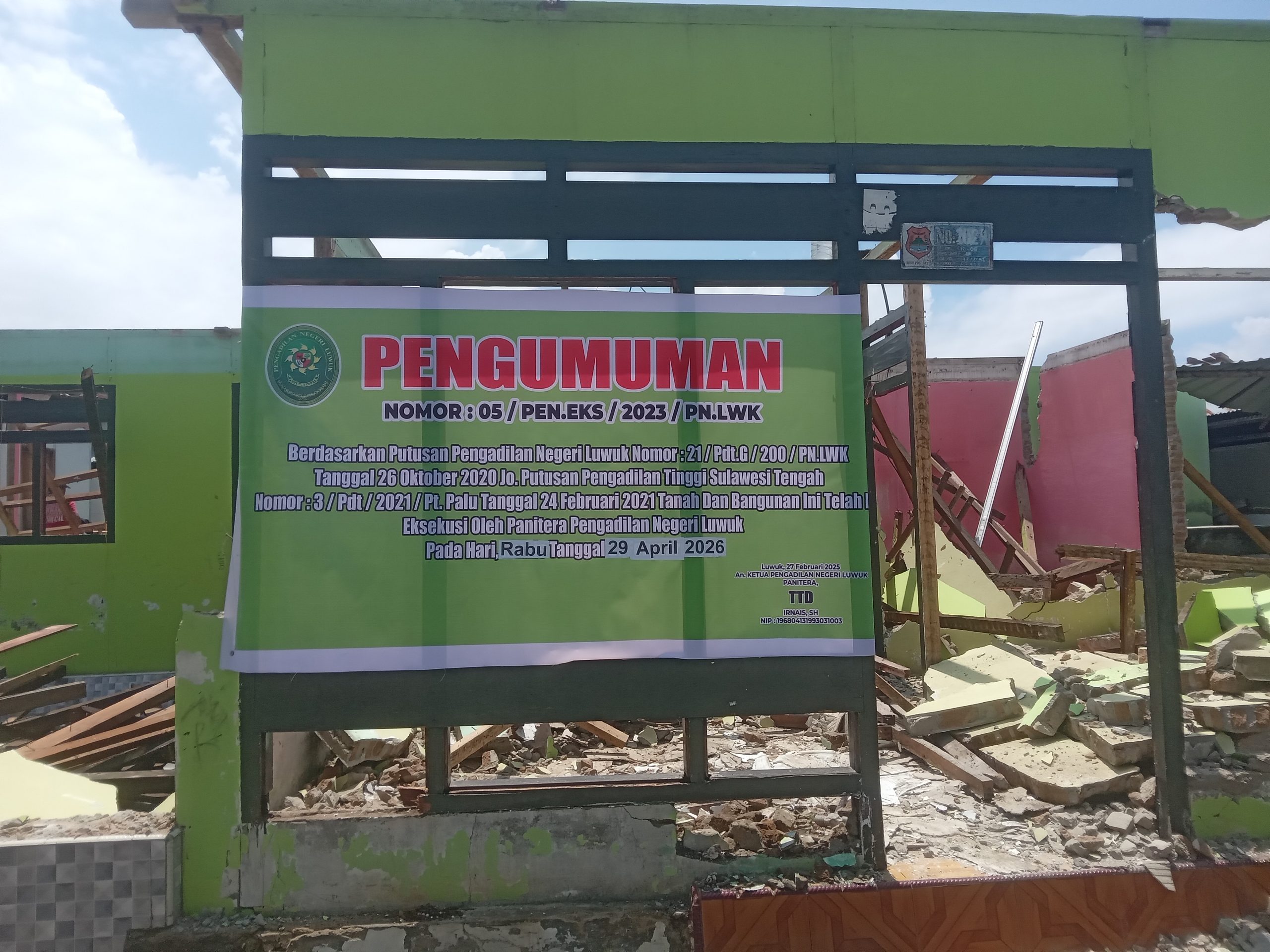 Eksekusi tersebut dijalankan berdasarkan pada Penetapan Ketua PN Luwuk Nomor 5/ Pdt.Eks/2023/PN Lwk, yang dipimpin oleh Panitera, Irnais SH berserta Jurusita.